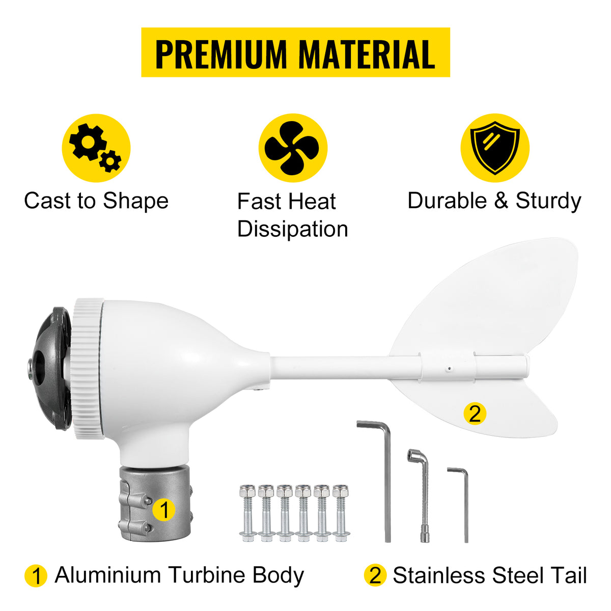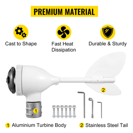 Diese Heimwindkraftanlage ist mit einem Gehäuse aus Aluminiumdruckguss und einem Heck aus Edelstahl ausgestattet. Die Merkmale sind Gussform in einem, hohe Intensität. Darüber hinaus ist die Oberfläche der Turbine mit Backlack versehen, der korrosionsbeständig, wasserfest und langlebig ist.